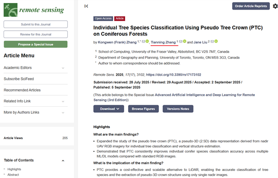 该研究由菲莎河谷大学Frank教授团队主导,张恬宁同学作为核心成员参与实验设计与数据分析工作。论文题为《Extending Pseudo-Crown (PTC) Representation for Coniferous Tree Classification in Canadian Boreal Forests under Snow-Covered Conditions》,提出了一种创新的“伪树冠”数据表示方法,显著提升了加拿大针叶林树种(如短叶松、花旗松、云杉及白杨)在雪覆盖背景下的遥感分类精度。