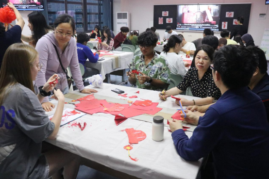在实践体验环节,外语角志愿者为参与者提供了剪纸材料和工具,分组进行指导。留学生们手持剪刀,小心翼翼地裁剪,虽然动作略显生疏,但在互相帮助下,都完成了属于自己的剪纸作品。