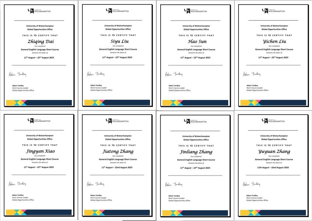 2025年8月9日至24日,湖南文理学院国际学院、美术与设计学院联合组织8名本科生赴英国胡弗汉顿大学(University of Wolverhampton)开展为期15天的“跨文化体验与专业融合”暑期研学。研学团围绕语言提升、专业实践、文化考察与学术交流四大模块展开,行程紧凑、内容丰盈,学生全部获得英方官方结业证书,安全零事故返校,为学校国际合作写下新的生动注脚。