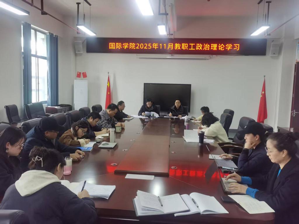 为加强师资队伍建设,提升教职工理论素养与职业道德水平,国际学院于11月18日下午组织全体教职工开展2025年11月政治理论学习。集体学习由党总支书记伍宗富主持,全体教职工参加了学习。