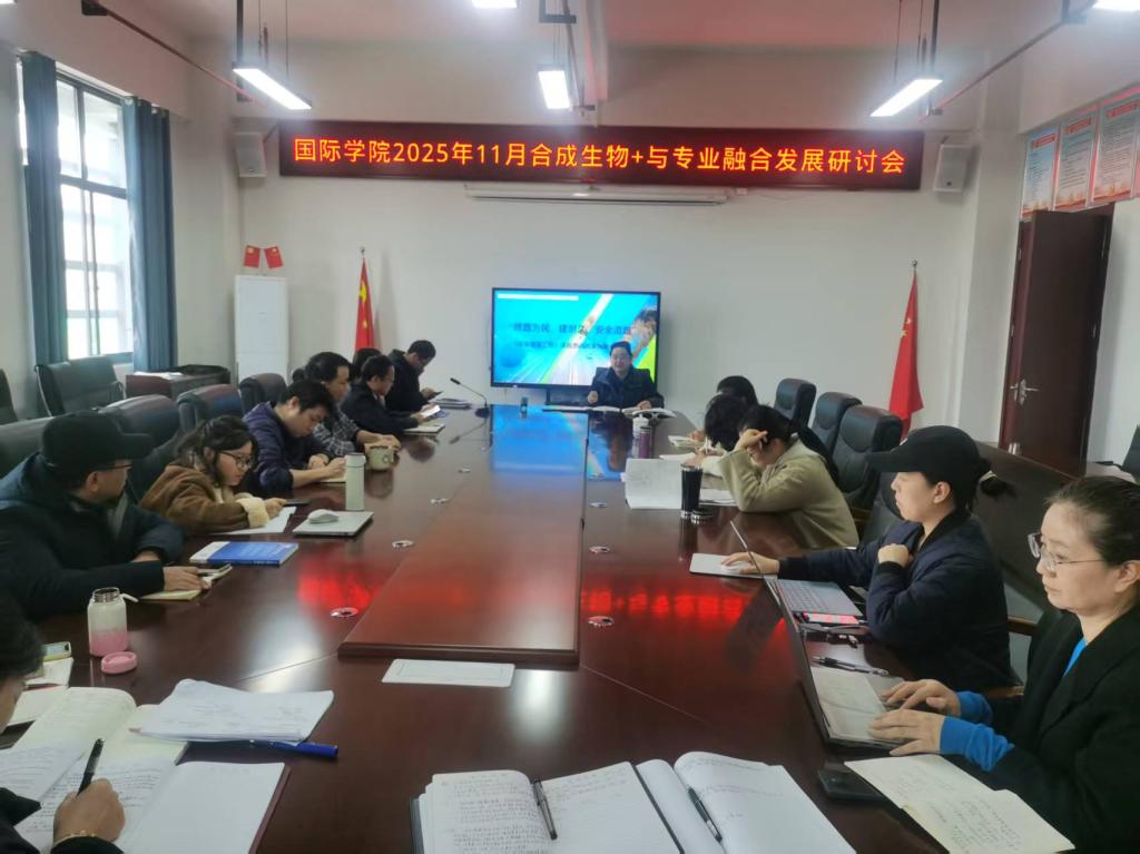 为推进学科交叉与前沿创新,国际学院于2025年11月18日组织召开“合成生物+专业融合发展”专题研讨会。党总支书记伍宗富主持会议,院长丁杰发表重要讲话,学院全体教职工参加了会议。