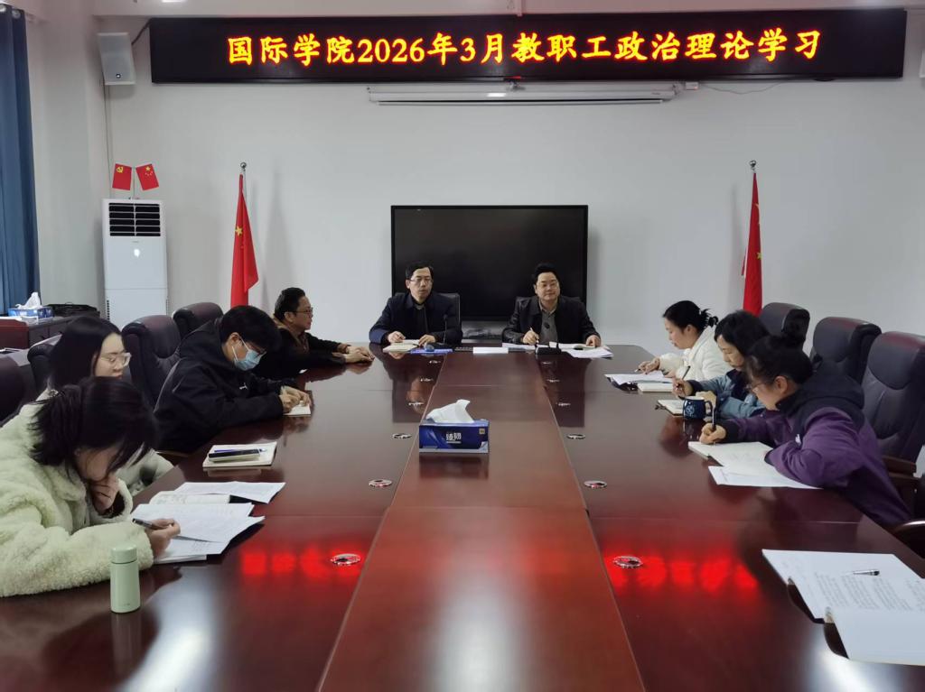 3月20日下午,国际学院在实训楼D807会议室召开2026年3月教职工政治理论学习会。学院全体教职工参会,会议由党总支书记伍宗富主持。