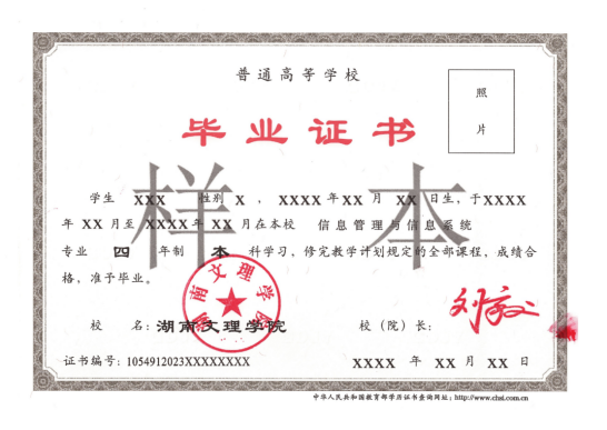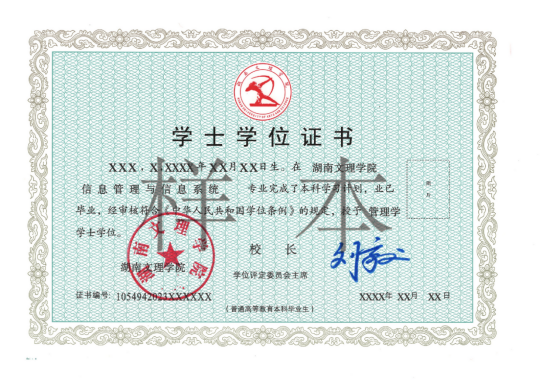 湖南文理学院证书样本