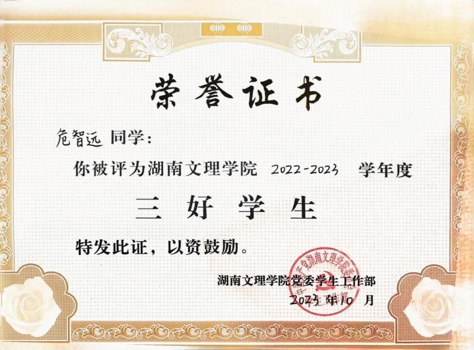 危智远,男,汉族,共青团员,机械设计制造及其自动化专业22103班学生,本学年综合成绩排名7/102。他学习上态度严谨,认真努力;部门工作上积极组织各项任务,荣誉感强。在未来他将继续勇往直前,向上攀登。
